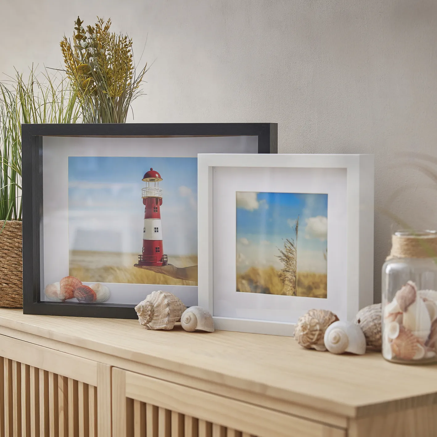 Wenn du dein Motiv in der Tiefe positionierst, hast du im Rahmen selbst Platz für kleine Deko-Elemente. Nutze den Platz zum Beispiel, um Urlaubsmitbringsel oder kleine Erinnerungsstücke zusammen mit dem Bild zu präsentieren.