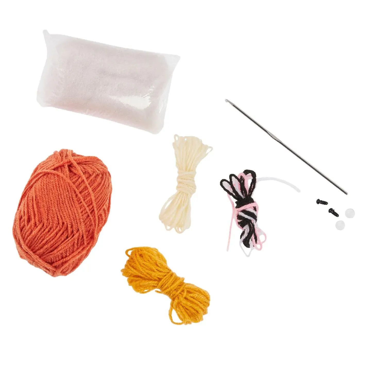 Häkel-Set: Häkelnadel 3 mm, Acrylgarn in verschiedenen Farben, Füllmaterial, Sicherheitsaugen und Anleitung.