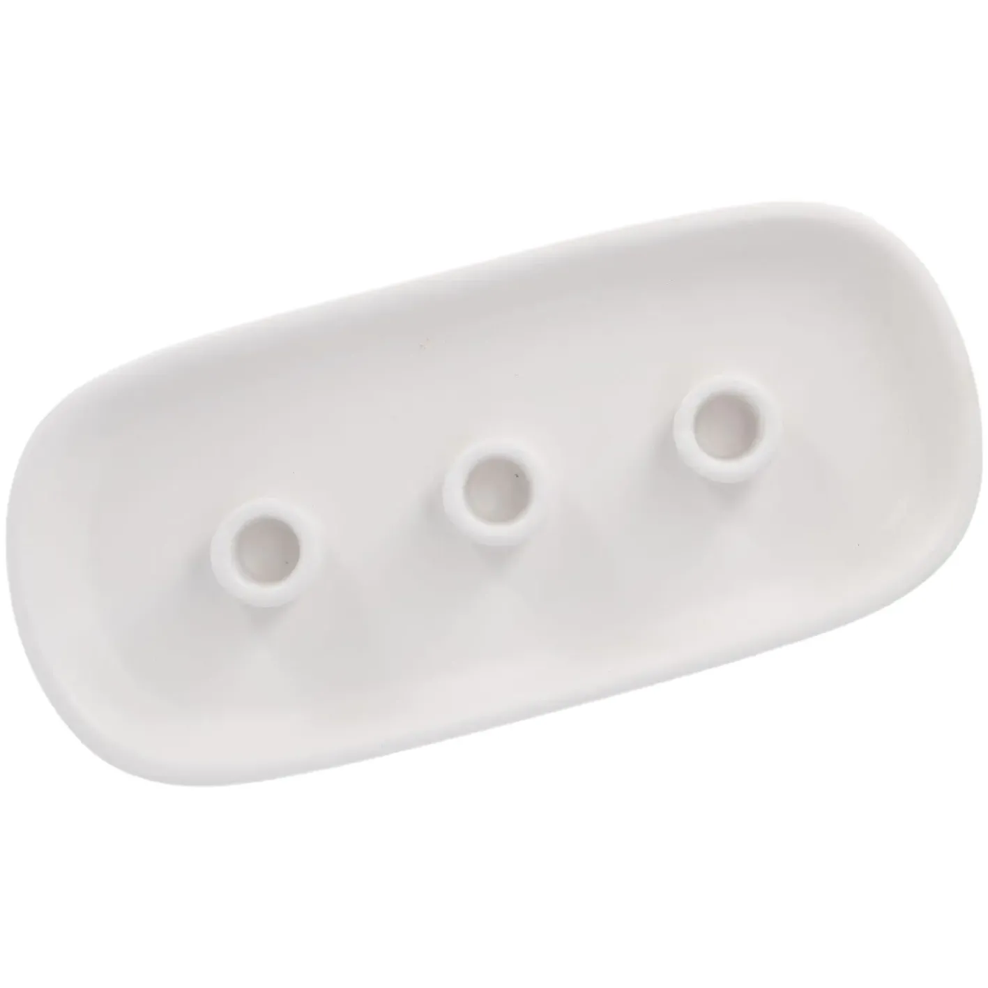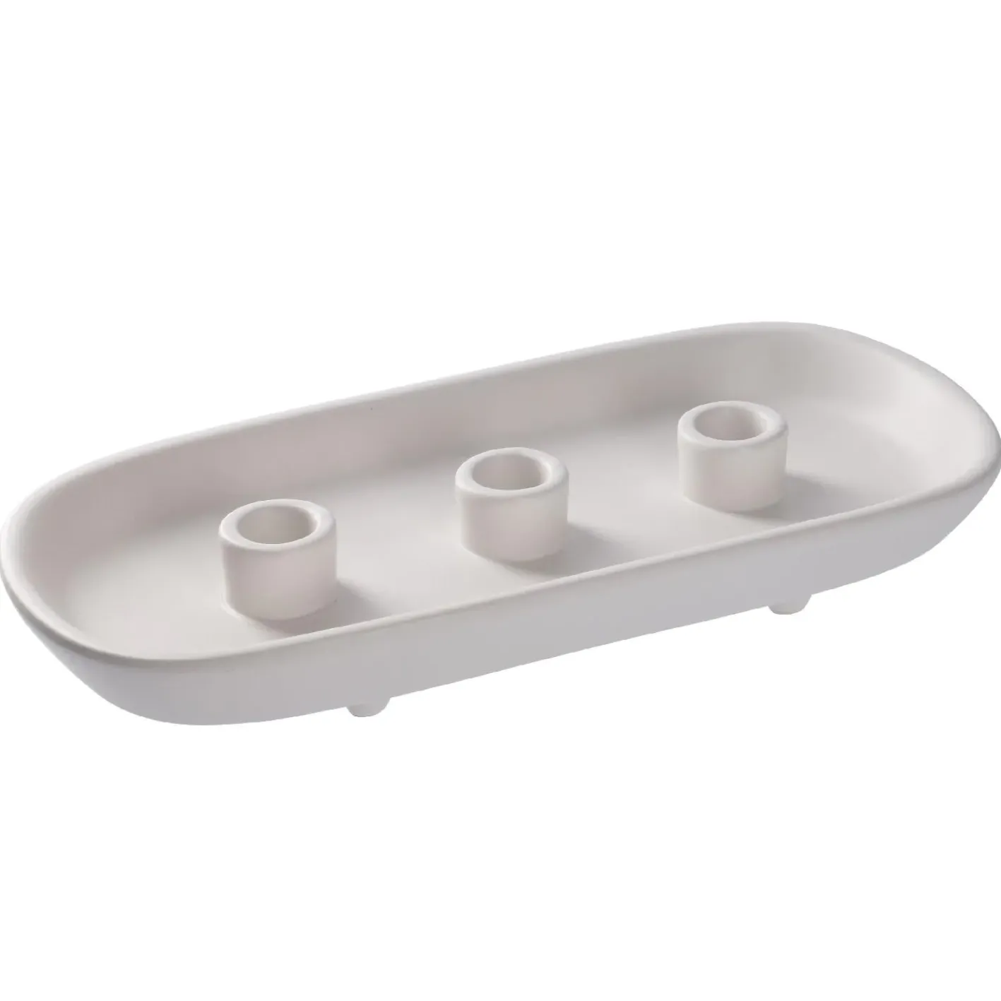 Dieser Stabkerzenhalter bietet Platz für drei Stabkerzen mit einem Durchmesser von 2.2 cm. Er ist aus Keramik gefertigt und insgesamt 30 cm lang.