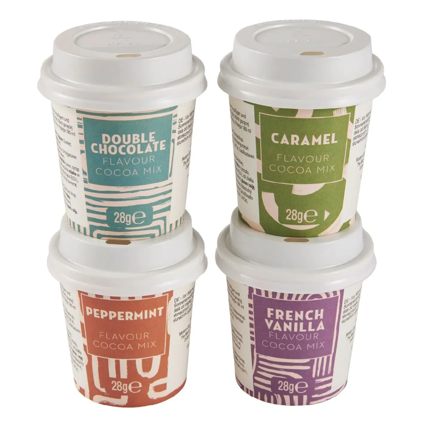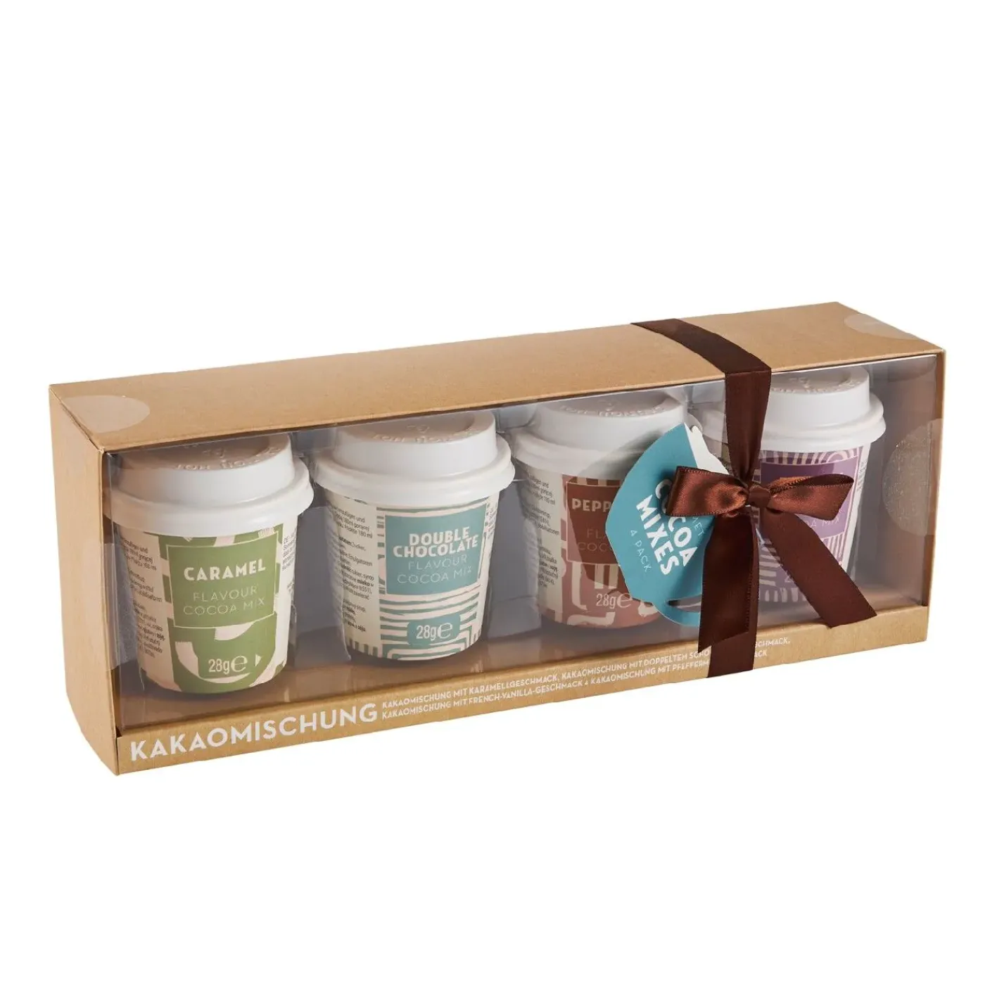 Vier verschiedene Kakaomischungen für einen schokoladigen Trinkgenuss.