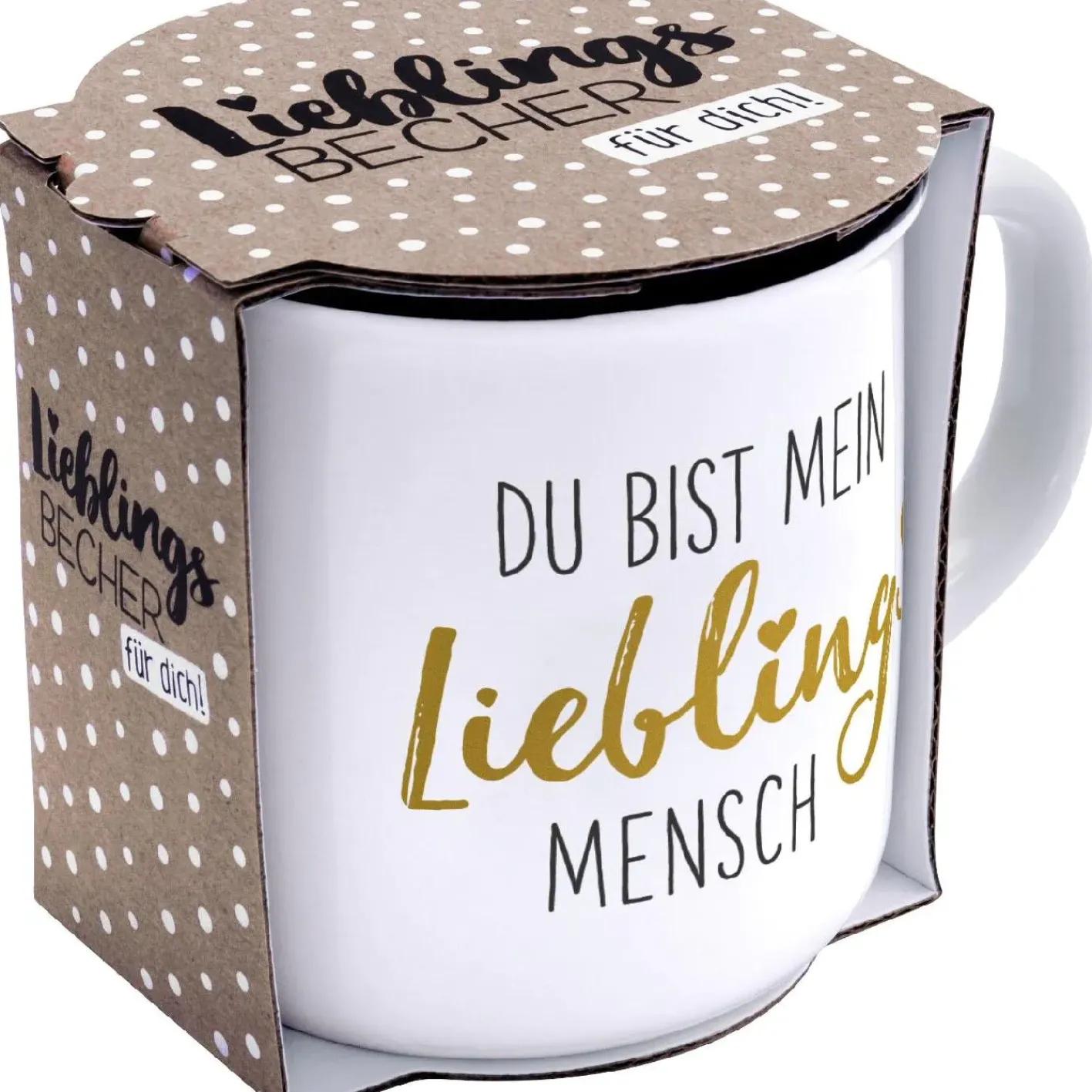 Jeder hat diesen einen Menschen, ohne den er nicht leben kann. Dieser eine Lieblingsmensch, der immer für einen da ist, durch dick und dünn geht und mit dem man alles bereden kann. Mache genau diesem tollen Menschen eine Freude mit dem trendigen Emaille-Optik-Becher mit Golddruck. Ob im Büro oder in der Freizeit, dein Herzensmensch wird immer an Dich denken, wenn er ihn benutzt.
