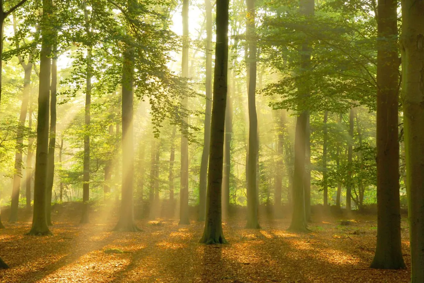 Wunderschönes Naturposter. Die Sonnenstrahlen suchen sich ihren Weg durch das Dickicht der Bäume.