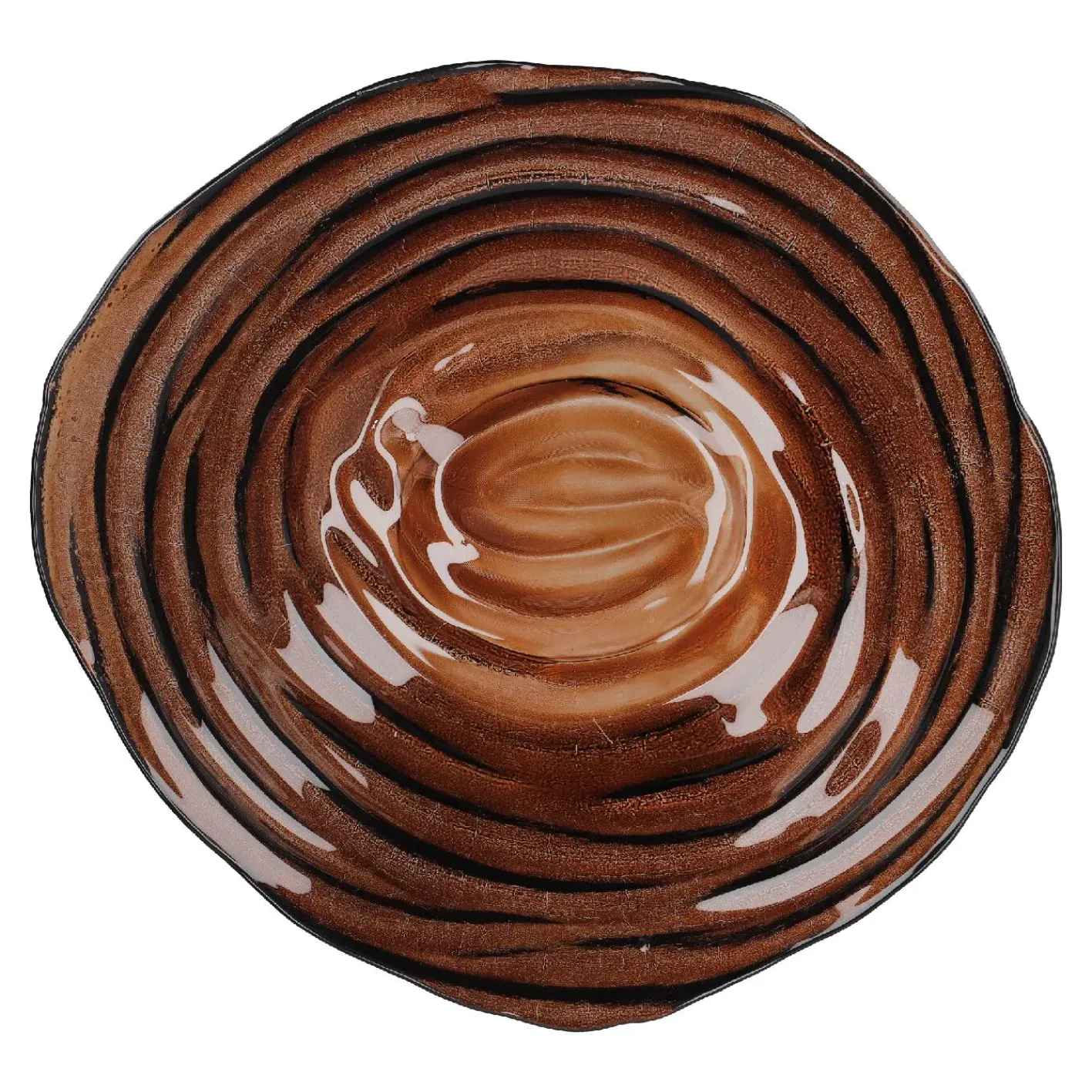 Diese braune Glasschale erinnert an einen Wirbelsturm. Durch die organische Form ist die Schale nicht ganz rund. An der breitesten Stelle ist sie 32 cm breit. Insgesamt ist sie 11.5 cm hoch.