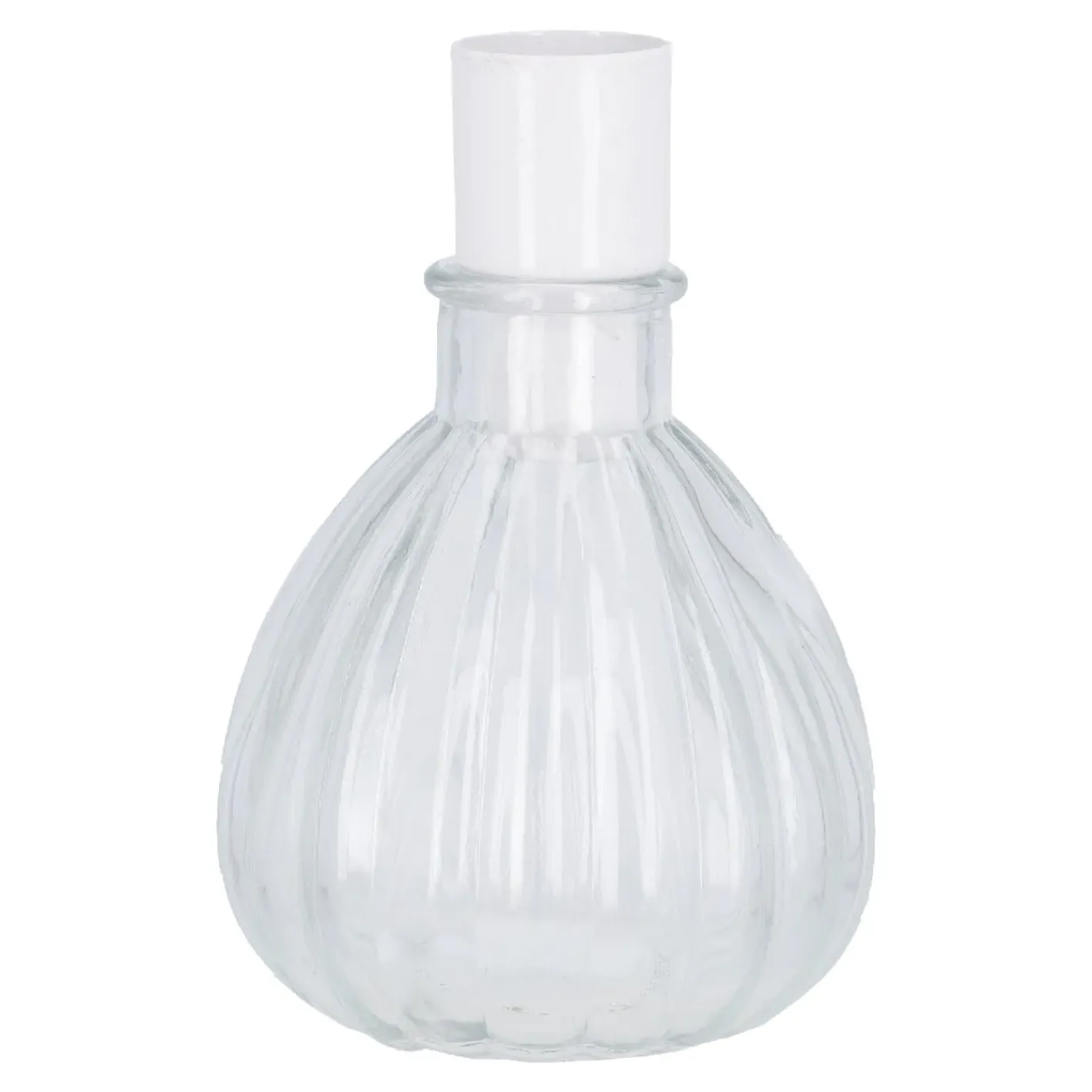 Schlichte Vase mit Rillen und einem weißen Aufsatz für eine Standard-Stabkerze. Der Kerzenhalter ist fest mit der Vase verklebt.