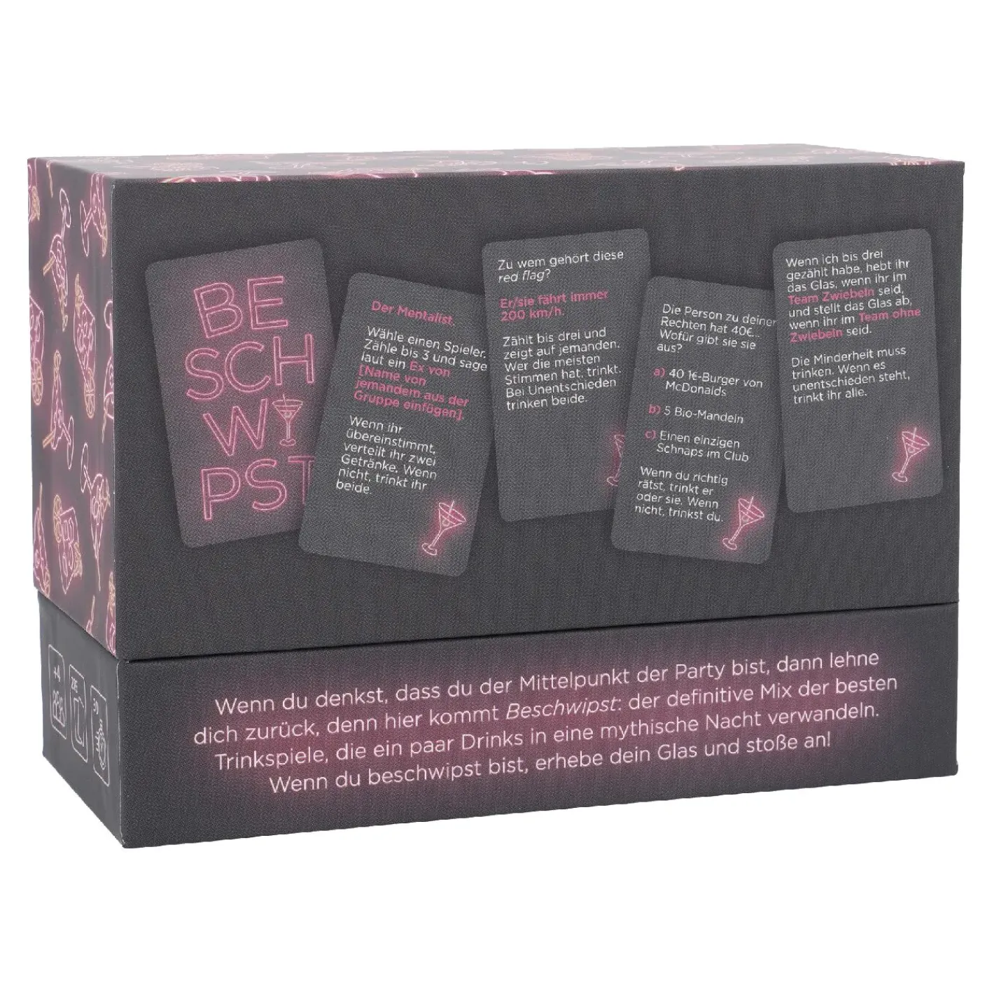 Wenn du denkst, dass du der Mittelpunkt der Party bist, dann lehne dich zurück, denn hier kommt ‚Beschwipst‘: der definitive Mix der besten Trinkspiele, die ein paar Drinks in eine mythische Nacht verwandeln. Wenn du beschwipst bist, erhebe dein Glas und stoße an!