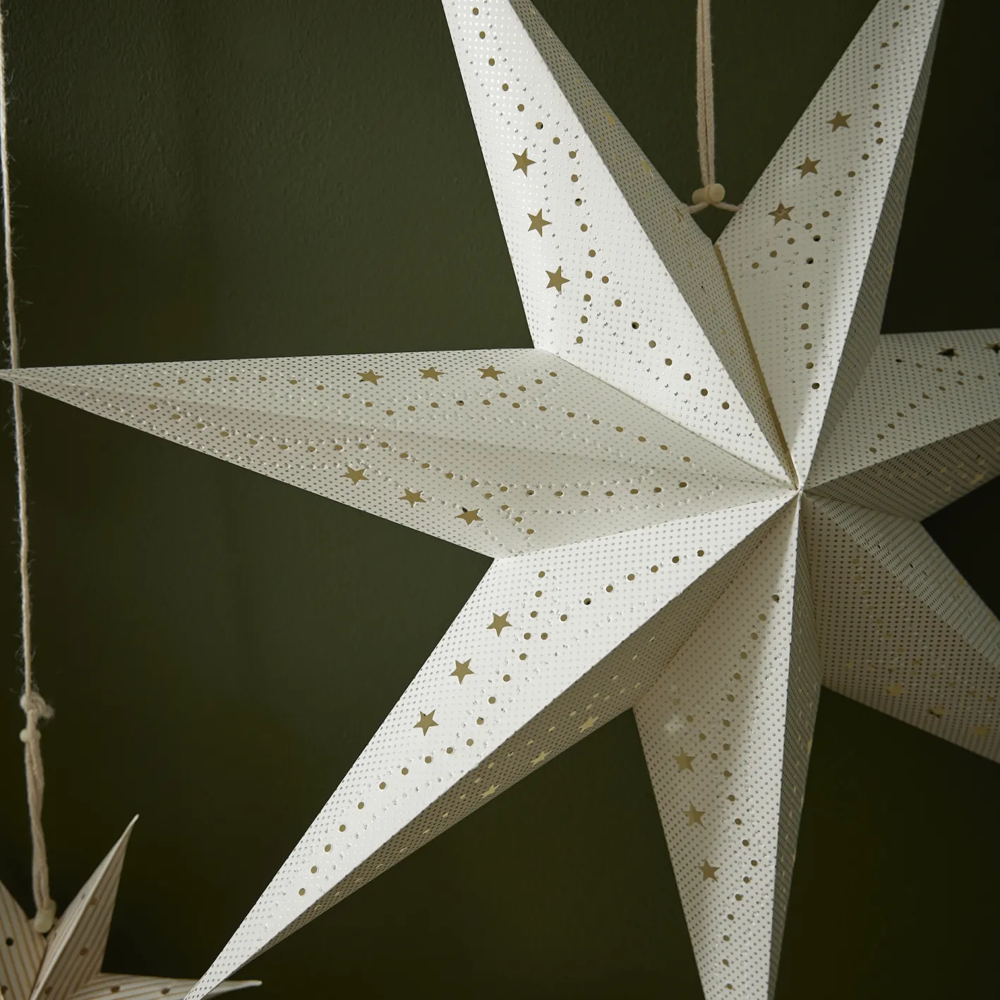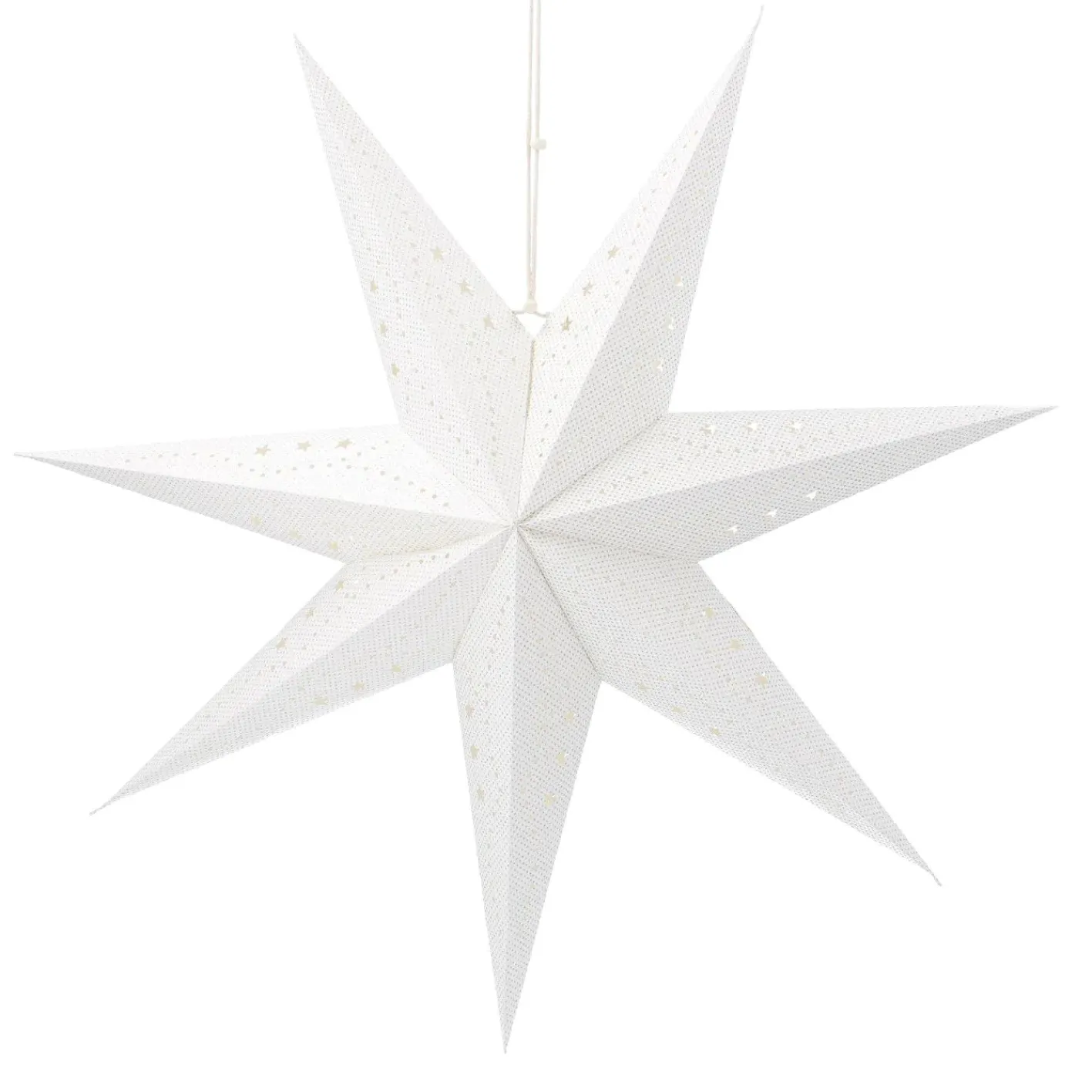 Sterne soweit das Auge reicht! Der weiß-silberfarbene Papierstern verziert deine Fenster und setzt sie weihnachtlich in Szene.Die Spannweite des Sterns beträgt 60 cm. Die angegebenen Maße beziehen sich auf den verpackten Stern.Leuchtmittel und Kabel sind nicht enthalten. Mit Band zum Aufhängen.